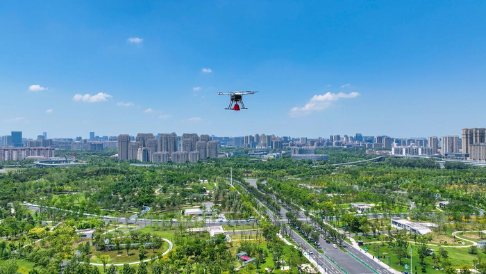 无人机在安徽合肥骆岗公园配送外卖(2024年7月5日摄,无人机照片)。新华社发(罗浩宇 摄)11月17日,零重力飞机工业(合肥)有限公司与景秀旅游签署战略合作协议并落地50架ZG-ONE鹊飞机型采购订单。