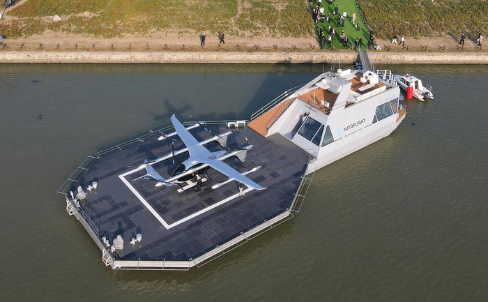 2025年11月22日,一架电动垂直起降飞行器停在全新亮相的零碳水上机场(无人机照片)。新华社记者 方喆 摄以转型为驱动