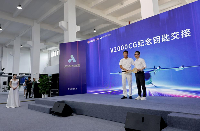 这是在交付仪式现场展示的V2000CG凯瑞鸥电动垂直起降航空器(2025年7月22日摄)。新华社记者 方喆 摄合利创兴智能总裁胡斌表示,他们这一次的合作已经和峰飞公司达成了三台航空器业务的合作。“未来,我们应用的场景包括山体物流的运输,跨海运输,岛与岛之间的运输。”胡斌说。