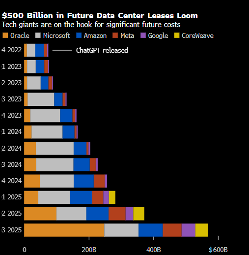 甲骨文在数据中心租赁方面投入的资金最多,仅在截至11月的三个月内就签署了价值约1500亿美元的协议,使其总承诺额达到2480亿美元。该公司正在着手建设历史性的数据中心,以支持OpenAI最新模型的训练和部署。